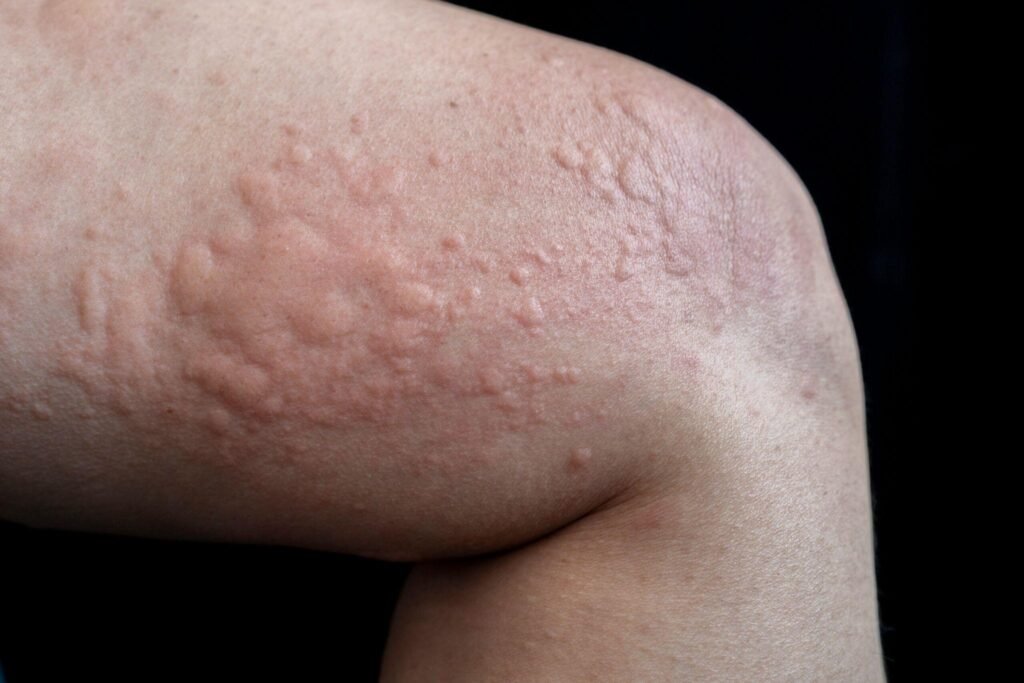 Urticaria, commonly known as hives, is a skin condition characterized by sudden, raised, itchy welts that may vary in size and appear anywhere on the body. These welts often change shape, move around, and fade within hours, but new ones may continue to form.
